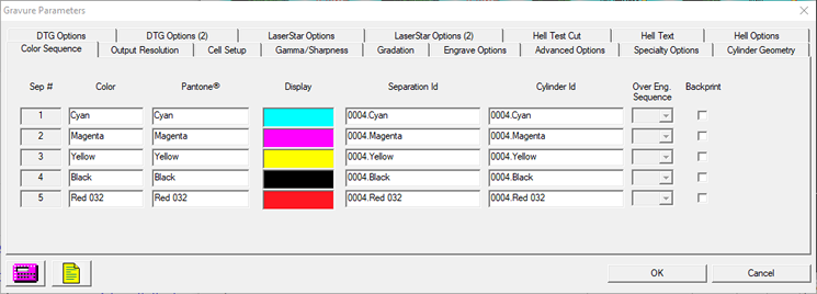 Use the Gravure Parameters window to set the output values for each separation of the job when the job will be engraved on an OHIO or Hell engraver, or a DTG-controlled engraver, or a LaserStar device.