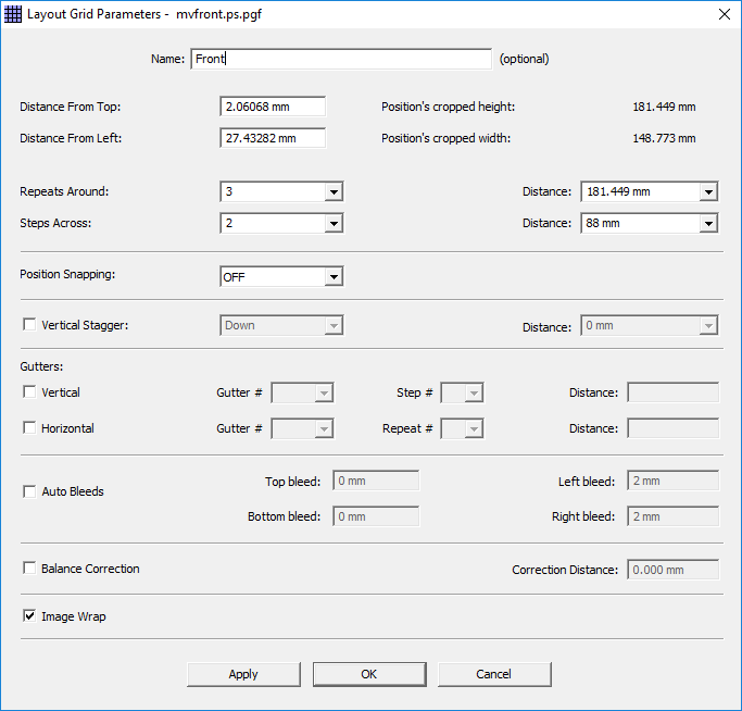 Use the Layout Grid Parameters window to lay out the images for the job. Set step-and-repeat values. Optionally turn on stagger, gutter, bleed or balance correction.