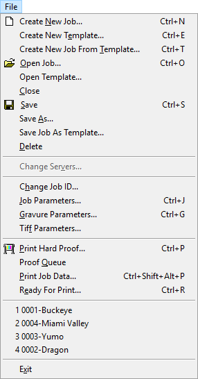 Use these commands to manage jobs and templates: create, open, save, copy (save as), and delete.