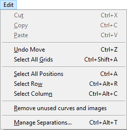 Select positions, rows, or column in a grid. Use this command to clean up a job. Open the Manage Separations window to delete separations or import separations from another job. |