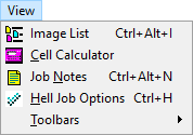 Use these commands to open the Image List, the Cell Calculator, Helio Job Options, or the Job Notes window, and to show or hide the toolbars (main and canvas dimensions). |