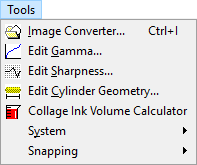 Use these commands to open a Collage module program. All can also be opened from desktop icons or from the Start menu. Use the System menu to open the Archive Manager, view the free space on the hard disk, and to set up User Preferences. |