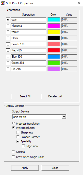 Use the Soft Proof Properties to change how you view the job when soft-proofing on-screen in prepress resolution or print resolution. Values set here also affect hard proofing.