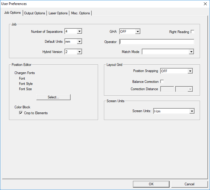 Set values for use in Collage jobs, and settings that affect the Collage user interface. The bottom section affects what tabs the Gravure Parameters window includes and the Defaults Editor.