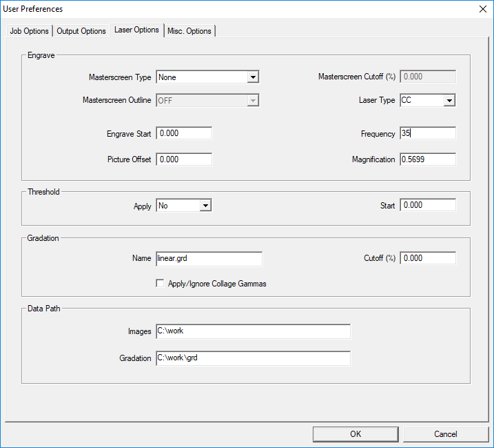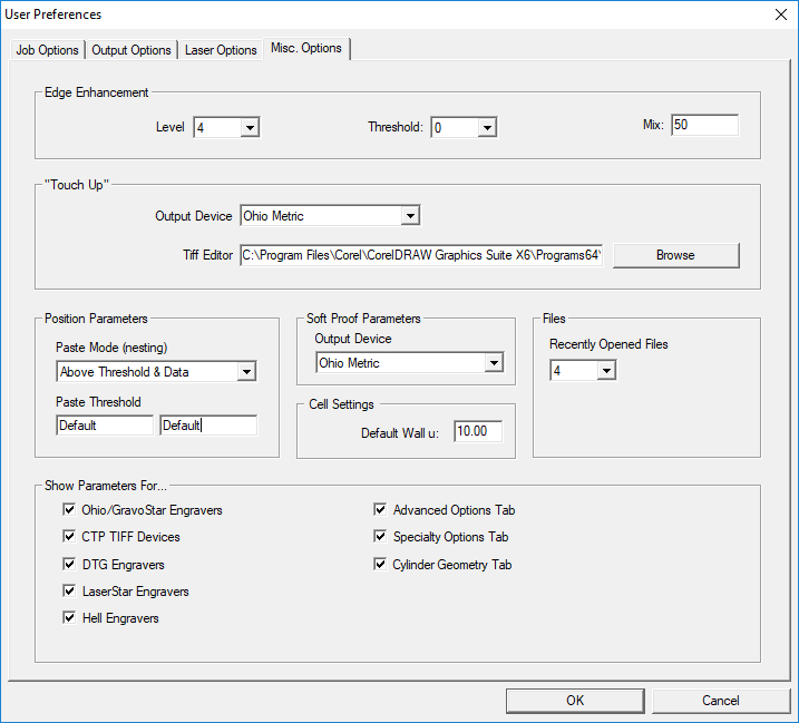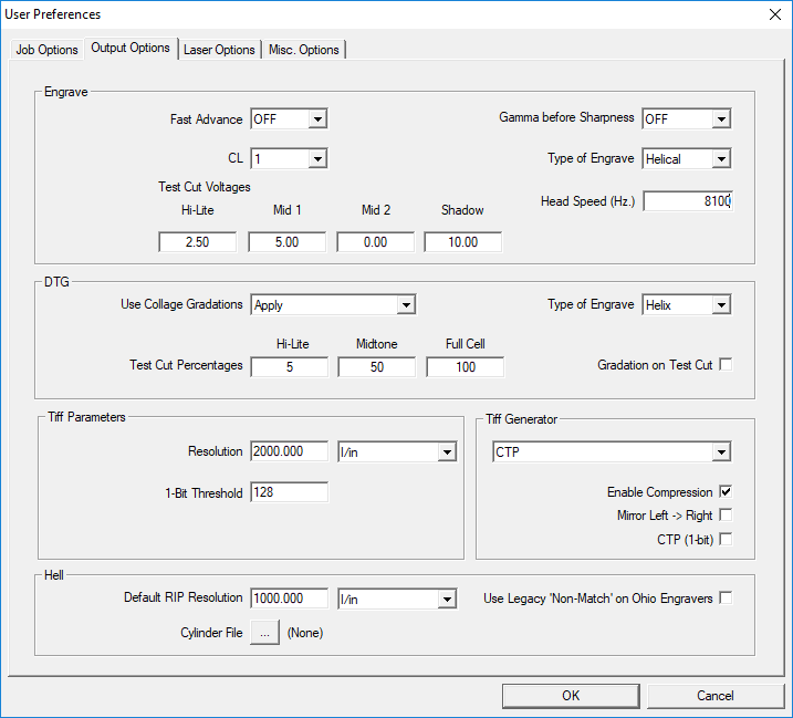 Set values for output to engravers (Ohio, DTG, Hell) and tiff.