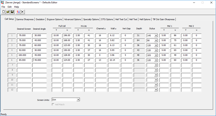 To use a defaults file, enter the defaults file name in the Customer field of the Job Parameters window. Then in the Gravure Parameters window, when you enter the Screen and Angle, the values from the defaults file will be pulled into the job.