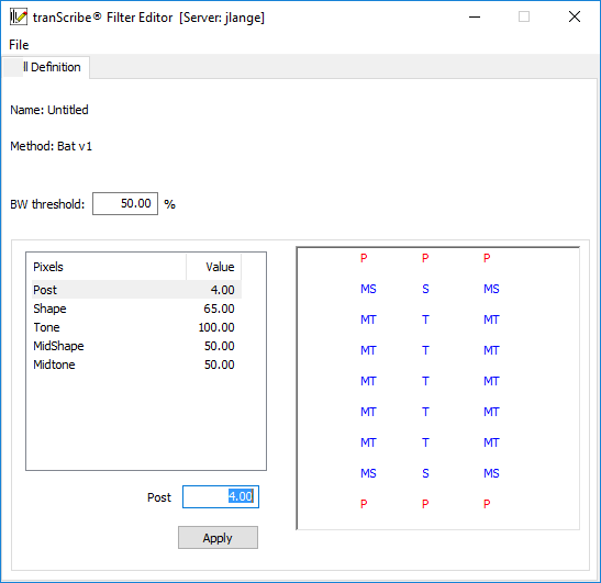 Use the tranScribe Filter Editor to define a tranScribe file. Creating tranScribe filters is a complex subject, with all the parameters that can be set, requiring examples and pictures to aid in understanding. For information on using the tranScribe Filter Editor and on creating tranScribe filters see Using tranScribe Engraving (# 9800-9463). This document is on your Collage installation disk.