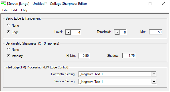 Collage includes several ways to sharpen an image using the Sharpness Editor, which includes Edge Enhancement, Densimetric Sharpness, and IntelliEdge. OHIO provides some edge curves, but you can define your own. Different curves can be applied to individual separations. Use the curve on only selected portions of an image; for example, negative text areas need different sharpness than positive text.