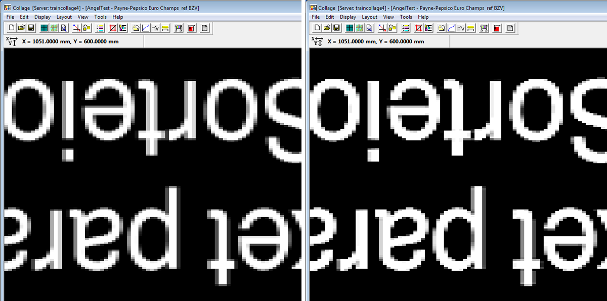 To improve fine details such as text, especially in Kanji or Arabic text, use IntelliEdge. Engraving fine details usually requires finer screens, which means longer engrave time, shallower cells, less ink and less color. With IntelliEdge processing, a coarser screen can be used. IntelliEdge is the Gravure equivalent of anti-aliasing. It uses inteligent algorithms to enhance vertical and horizontal strokes differently. By fattening the verticals and thinning the horizontals, the printed results are improved. IntelliEdge does not affect CT data: Use Densimetric Sharpness for CT.