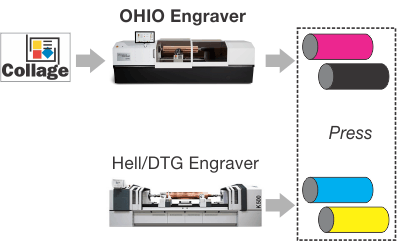 With only a single software to learn and use for job setup, productivity increases. Set the job up once and send to any available engraver. And only Collage allows a job to be split: engrave some cylinders on an OHIO engraver and some on the Hell engraver—without moiré.