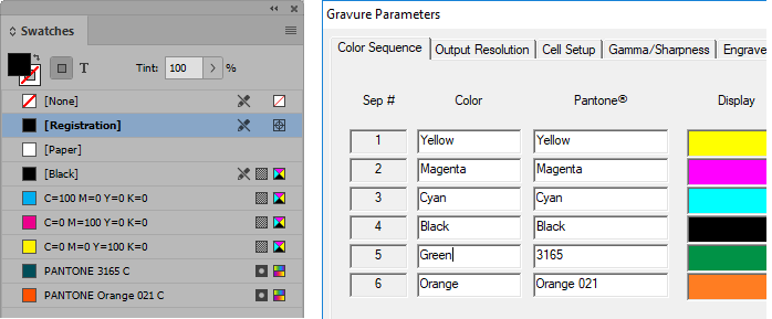 When an image is created, each color name is stored in the PDF file. The RIP uses that color name information to assign each color to a separation in Collage. In the Collage Gravure Paramenters window, each separation should have a name that matches the color names in the PDF.