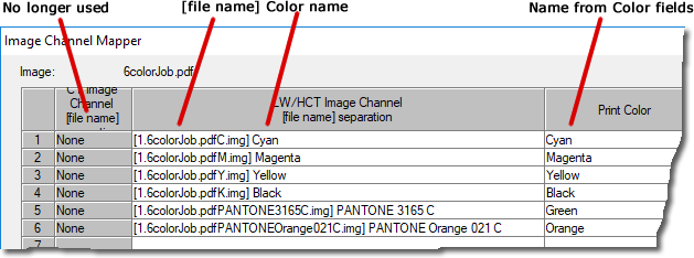 The LW/HCT Image Channel lists the separations from the PDF. It shows the file name and color name. Here, the PDF was called "6colorJob" and it was created with the process colors and two spot colors. Note that #5 is called PANTONE 3165 C and it is matched with the Green Print Color. This is because the Pantone field in the Color Sequence page is set to 3165.